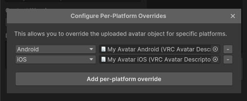 After setting up per-platform overrides, the SDK will build and upload the "override" version of the avatar for each platform when you do a multi-platform build.